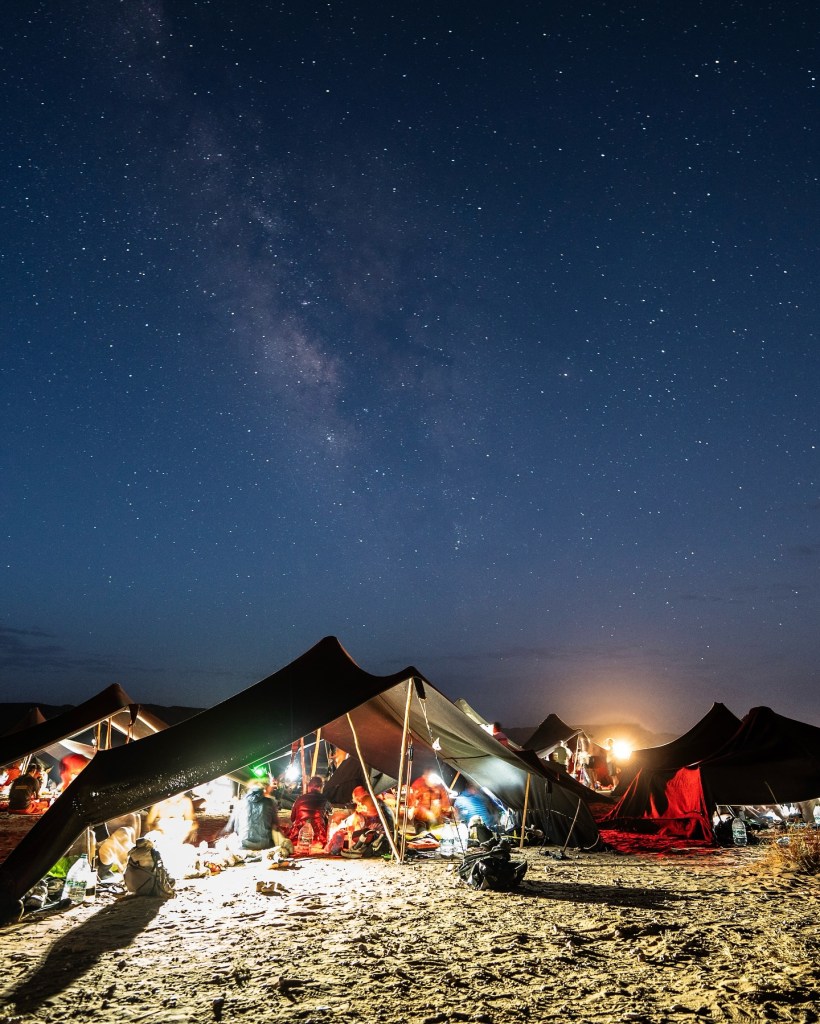 Après 5h37 de course, je franchis la ligne d’arrivée. Un pur plaisir de déguster le thé quotidien offert à l’arrivée, un petit rituel qui me booste à chaque fois ! ☕ Les gilets bleus nous applaudissent et les gilets oranges vérifient que tout va bien. En arrivant au bivouac, je vois que les tentes ne sont pas encore toutes montées, mais merci aux berbères qui bossent dur pour tout installer ! 🙏