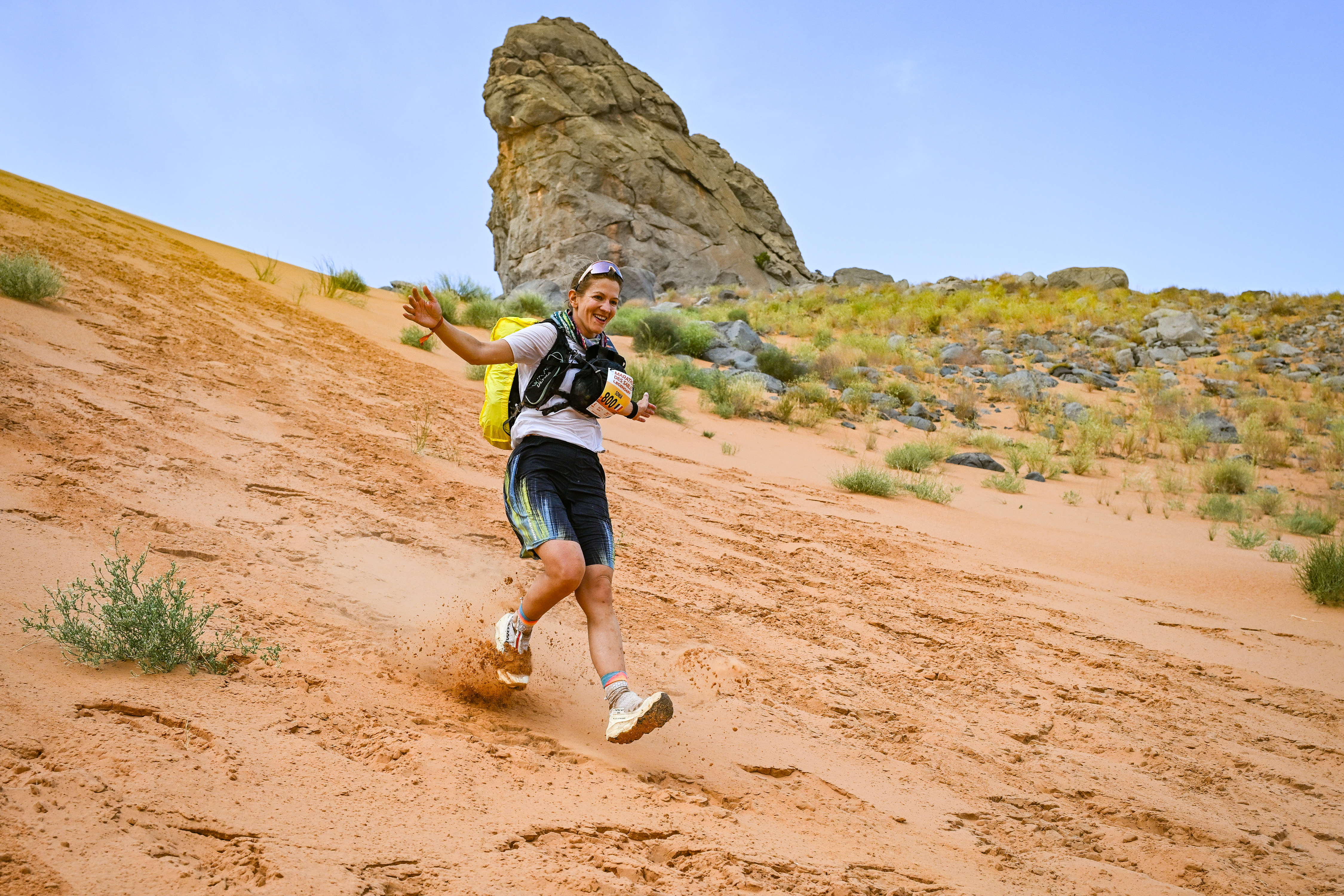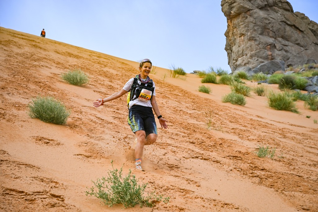 La fin de la course se présente sous la forme de dunes successives, sur plusieurs kilomètres, qui ne sont pas faciles, mais que je gère tant bien que mal. Mes petites ampoules me rappellent leur présence, mais ce n’est rien. Pas le temps de se concentrer sur ça. Je suis dans ma bulle et je me projette déjà sur la ligne d’arrivée. Je sens que je suis proche du but, et ça me booste encore plus. J’accélère. Je file, comme un dernier souffle de vent avant de franchir la ligne d’arrivée. Pas peu fière de moi.