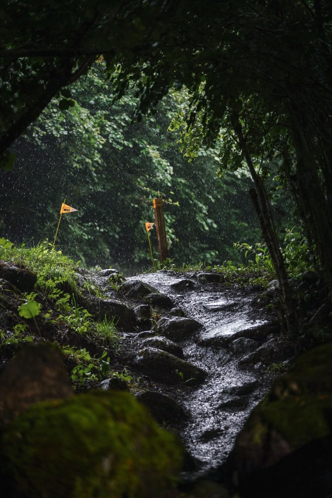 Très vite, la pluie s’intensifie. Rien de violent au début, mais suffisant pour installer l’ambiance : ce sera humide. Dans la première vraie montée, les choses se corsent : la pluie redouble, et l’orage commence à gronder au loin. À ce moment précis, je suis profondément soulagée que l’organisation ait activé le parcours de repli. Moins exposé, moins haut, mais vu les conditions, c’est clairement le bon choix.
