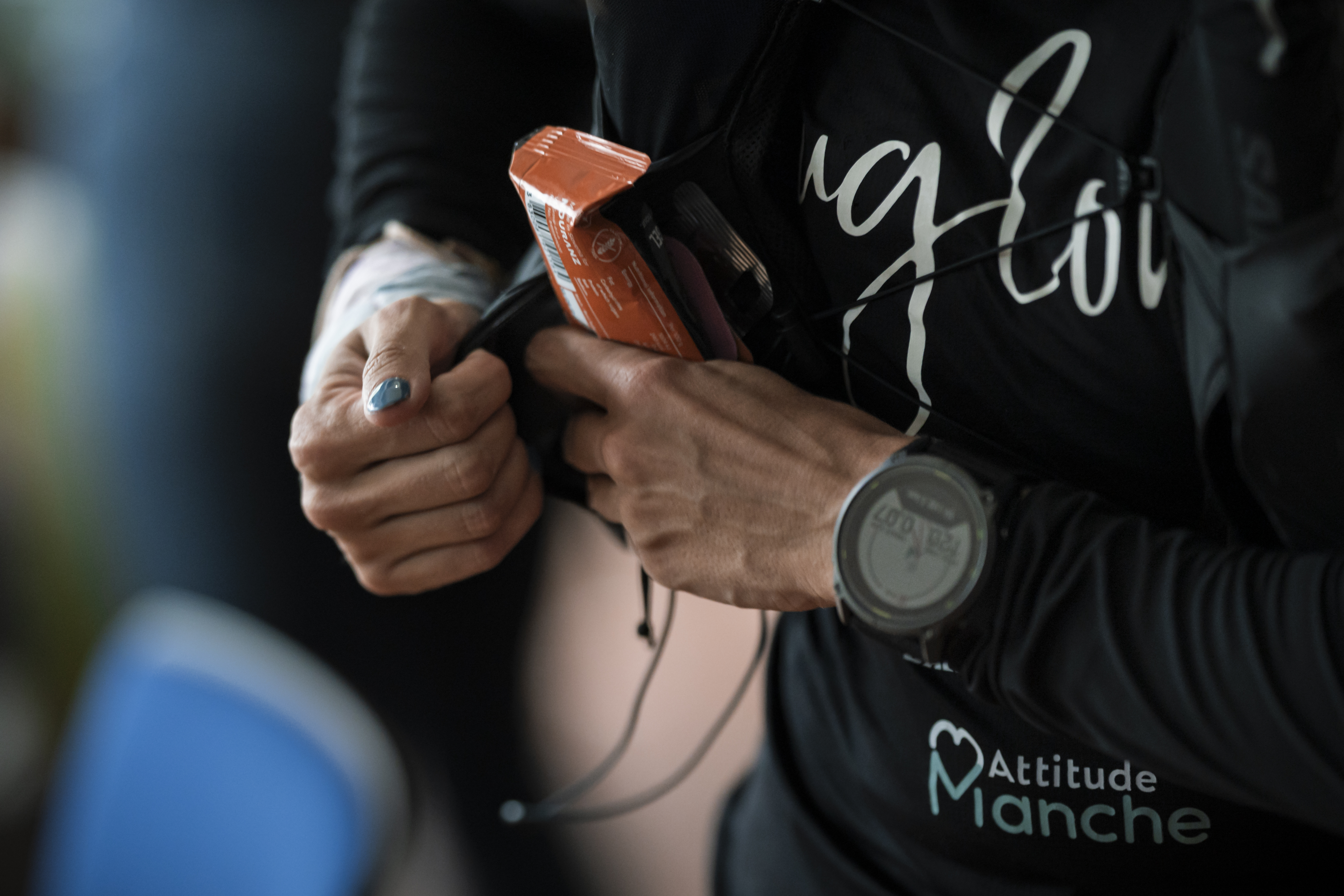 La veille, j’apprends que je suis 8ème au classement féminin. Mais attention, les filles derrière sont des fusées sur des distances courtes, et elles ne sont même pas à 8 minutes derrière au général. Pas le choix : si je veux garder ma place, je dois y aller à fond. Je modifie mon « packaging » : flasque de 50 cl dans la poche ventrale, deux petites gourdes de 250 mL sur les épaules. Ma bouteille d’1L, je la laisse dans le sac pour respecter le matériel obligatoire, mais je la garde au cas où. (Après tout, un petit sachet zip aurait sûrement suffit… cf Vincent Bouillard, à méditer pour la prochaine fois ? 😉)