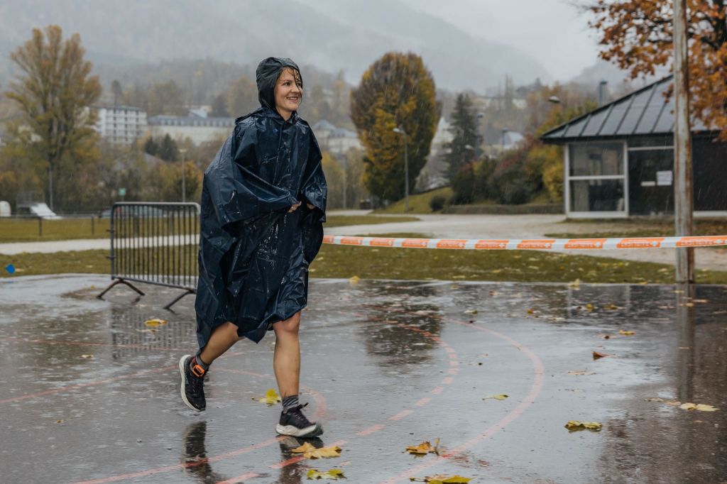 Vers 00h, la pluie commence à tomber. A 2h du mat’, on se retrouve à deux avec Anthony . Je me surprends à commencer à bien apprécier cette boucle. J’y trouve un côté réconfortant. Je me sens vraiment bien. La pluie s’intensifie au cours de la nuit. À 5h du mat’, ma frontale décide de me lâcher en début de boucle (trop d’humidité ?). L’assistance en cours de boucle étant disqualifiante, il va falloir que je me débrouille à la lumière de mon téléphone (matos obligatoire, heureusement). J’arrive à finir le tour dans mon temps habituel, en y voyant très peu, je me demande encore comment j’ai réussi à avancer si bien dans la nuit. À chaque boucle, on se croise avec Anthony. On échange quelques encouragements. Les trombes d’eau transforment le sentier en un petit cours d’eau. Je ne cherche pas mon chemin et je file droit dans l’eau depuis plusieurs heures. À chaque tour, Mehdi sèche mes vêtements et je repars comme neuve, avec mon poncho. Je n’ai pas changé mes sous vêtements Hästko ni mes souliers Nnormal de toute la course.