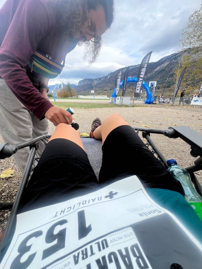 Je m’hydrate et m’alimente assez bien (purée, riz, bonbecs’, céréales au lait, quelques gels, petits pots pour bébé et bouillon seront mon principal carburant). Mehdi prend soin de mes p’tits muscles à coup de léger massage avec huile et pistolet (merci Albertville Terre de Running ). Pas de bobos à signaler, grâce à la prépa au top de Cindie, toujours à l’écoute